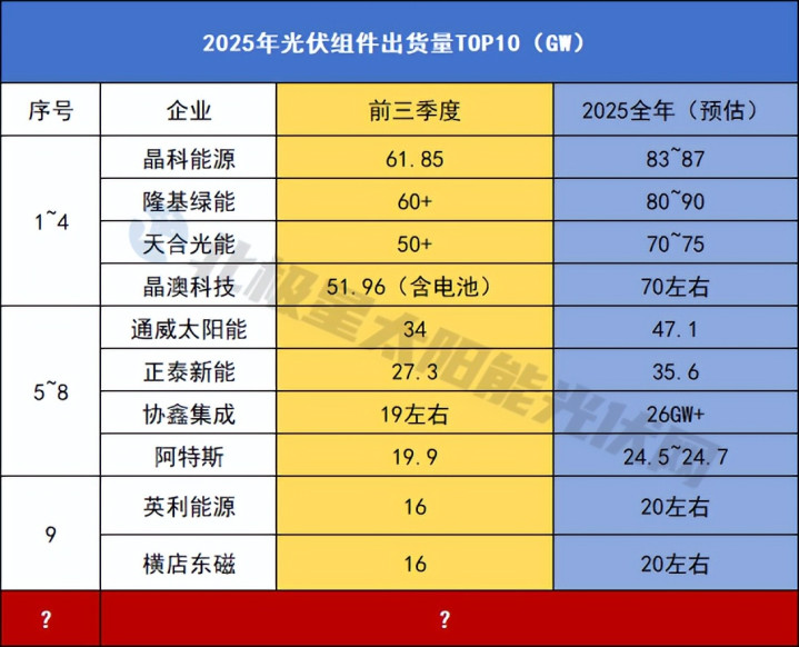 尽管行业低谷时期,出货量堪称一把“双刃剑”,但作为企业抢单的核心门槛之一,依旧是多数企业不敢轻视的核心指标。那么在利润的取舍权衡之下,2025年光伏组件出货量TOP10又将如何呈现呢?