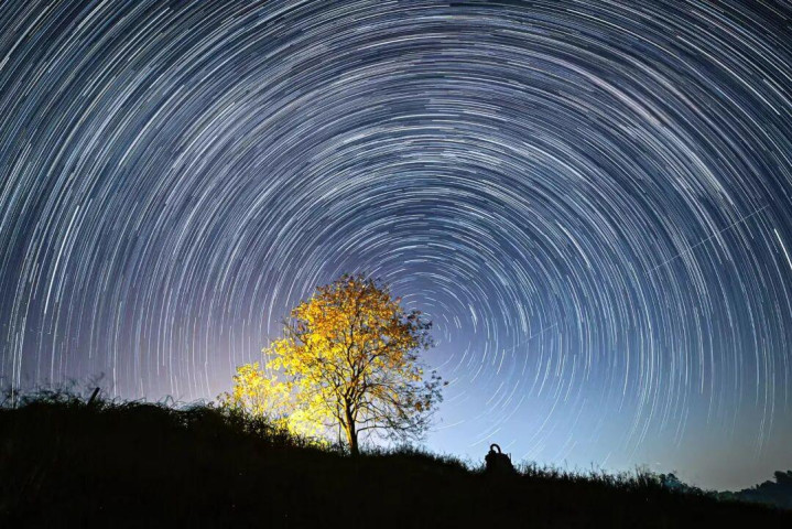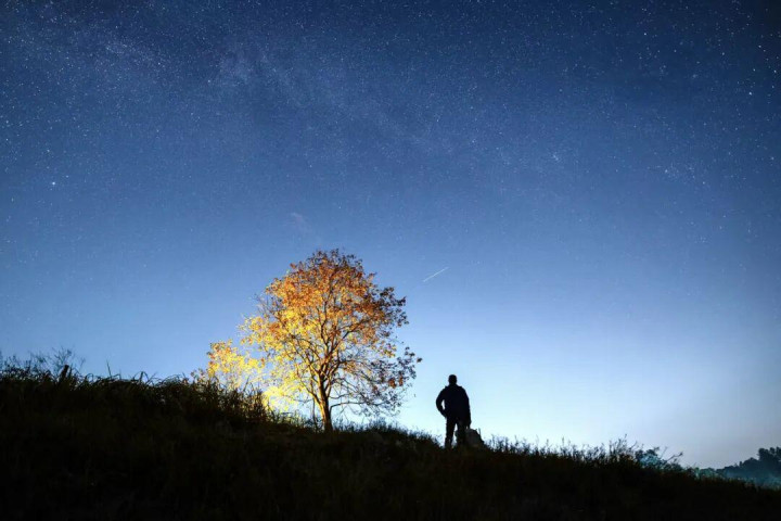 当夜幕降临,花石水库上空的星空成为主角。远离城市光污染,这里的星空格外清澈明亮。乌桕树孤独的剪影与璀璨的星河形成对比,既显得渺小,又仿佛连接着天地,让我心生敬畏。