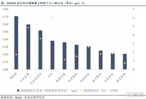 从主动偏股型基金细分行业持仓占比变化来看,二级行业中剔除股价影响后,保险重仓占比显著提升。