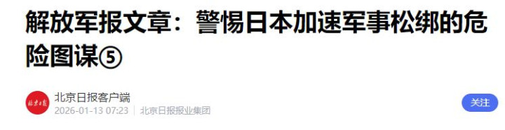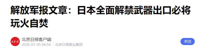 《解放军报文章:日本全面解禁武器出口必将玩火自焚》;北京日报客户端;2026-01-05;