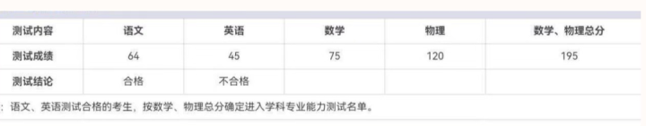一位网友晒出成绩单截图,底部有一句说明:语文、英语测试合格的考生,按数学、物理总分确定进入学科专业能力测试名单。