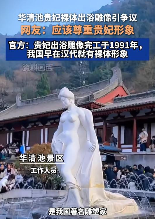 近日,有网友发帖称,西安临潼华清池景区内的“贵妃出浴”雕像因袒露上半身,存在“不雅观”“败坏社会风气”等问题。相关帖子发布后,迅速引发关注和热议。