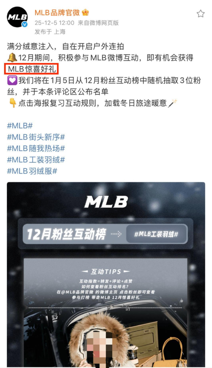 极目新闻记者在MLB品牌官方微博看到,这条引发争议的抽奖活动发布于2025年12月5日。文中称,12月期间积极参与该品牌微博互动,即有机会获得“MLB惊喜好礼”,并将在2026年1月5日从“12月粉丝互动榜”中随机抽取3位粉丝,在评论区公布名单。该博文的配图是一件MLB工装羽绒服的广告,图片上写有“12月粉丝互动榜→#MLB工装羽绒”字样。