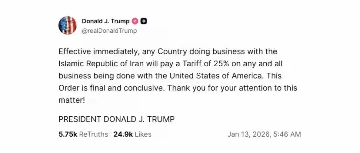 突如其来的贸易新规搅动了原本就不平静的伊朗局势。特朗普没有走传统的武力路线,反手抛出一记关税重拳。从1月12日起,任何与伊朗做贸易的国家,只要与美国存在商业往来,都不得不面对25%的高额关税。这一政策一经抛出,未待细则出台,风险已然蔓延开来。